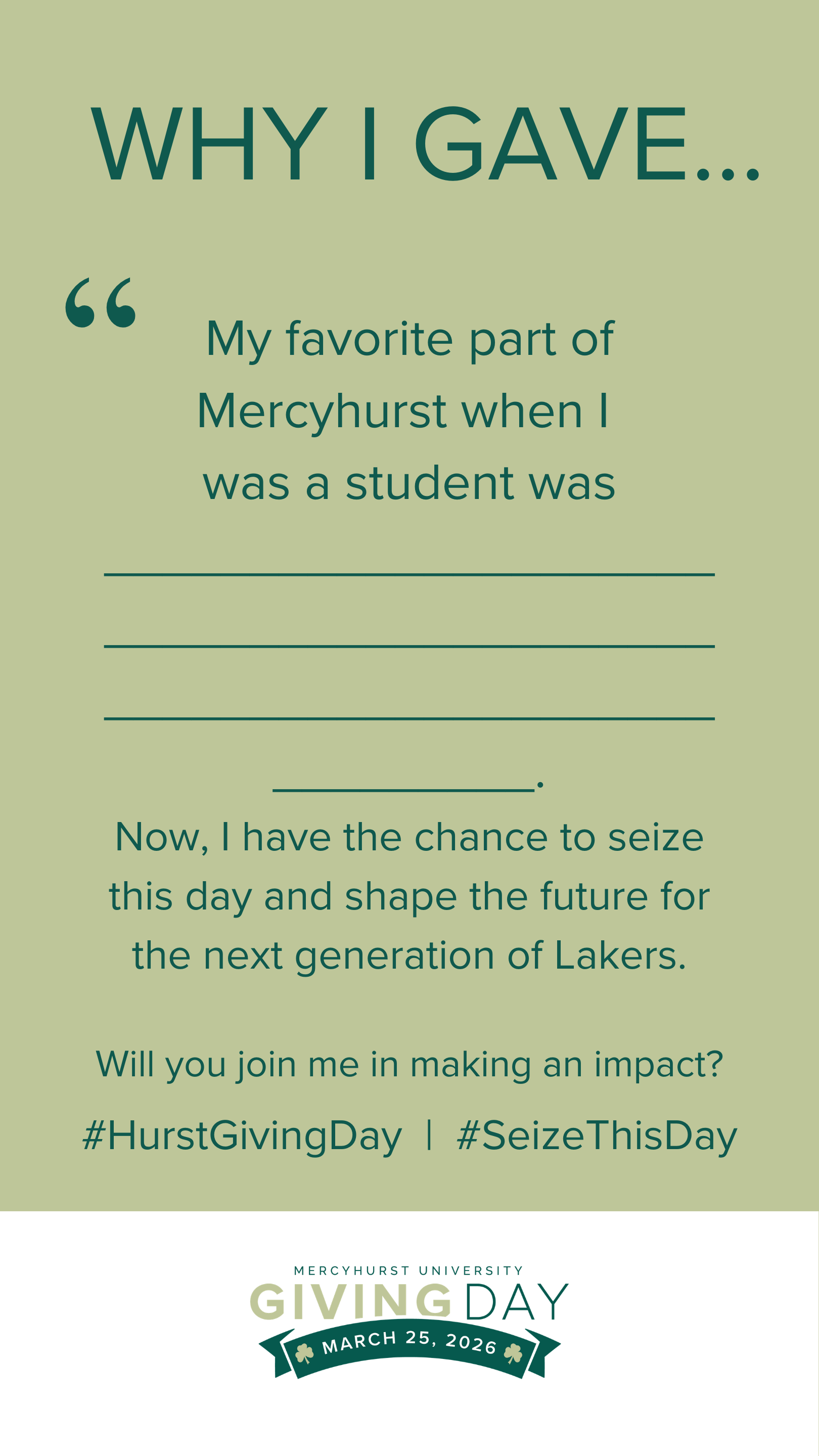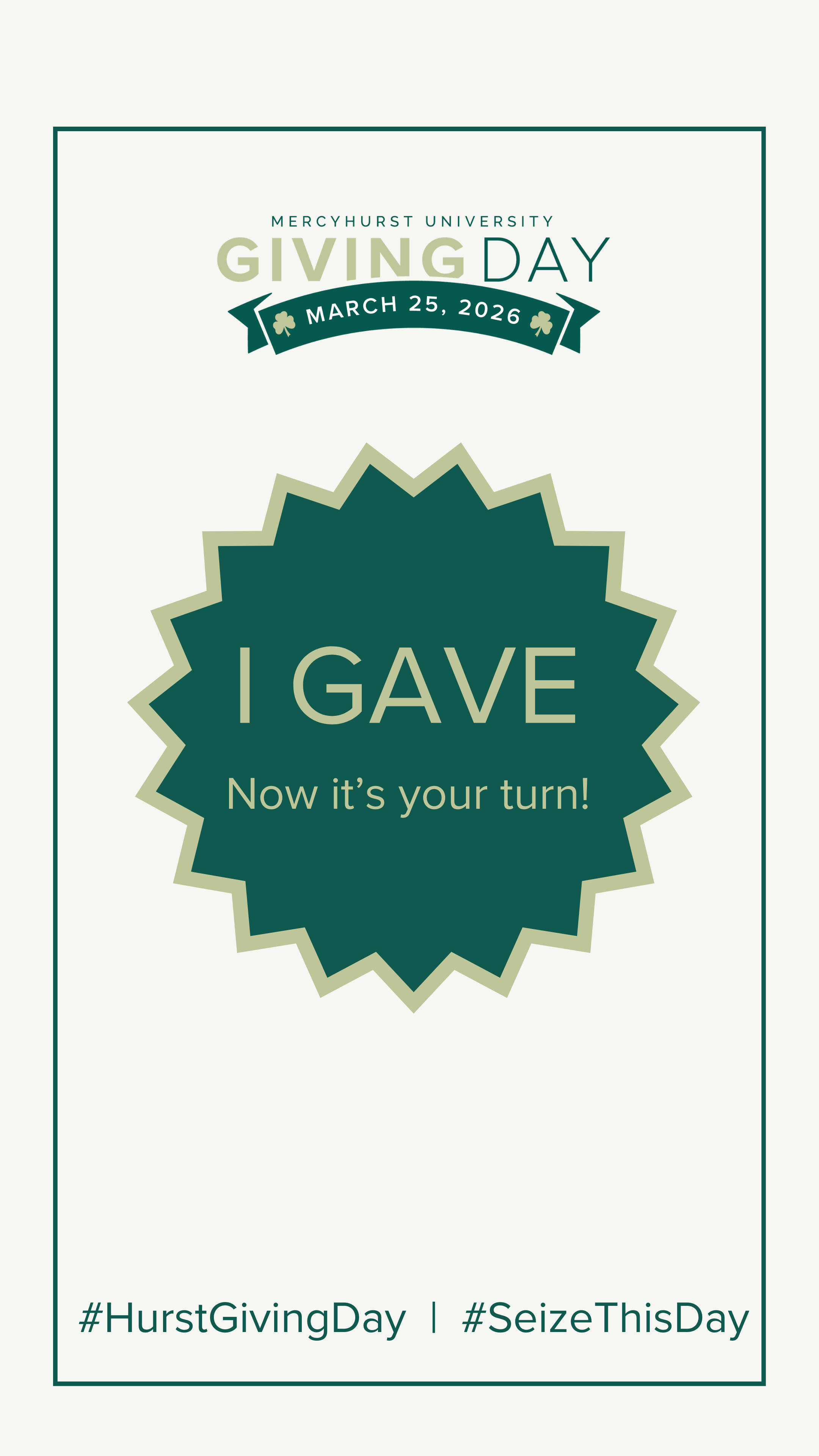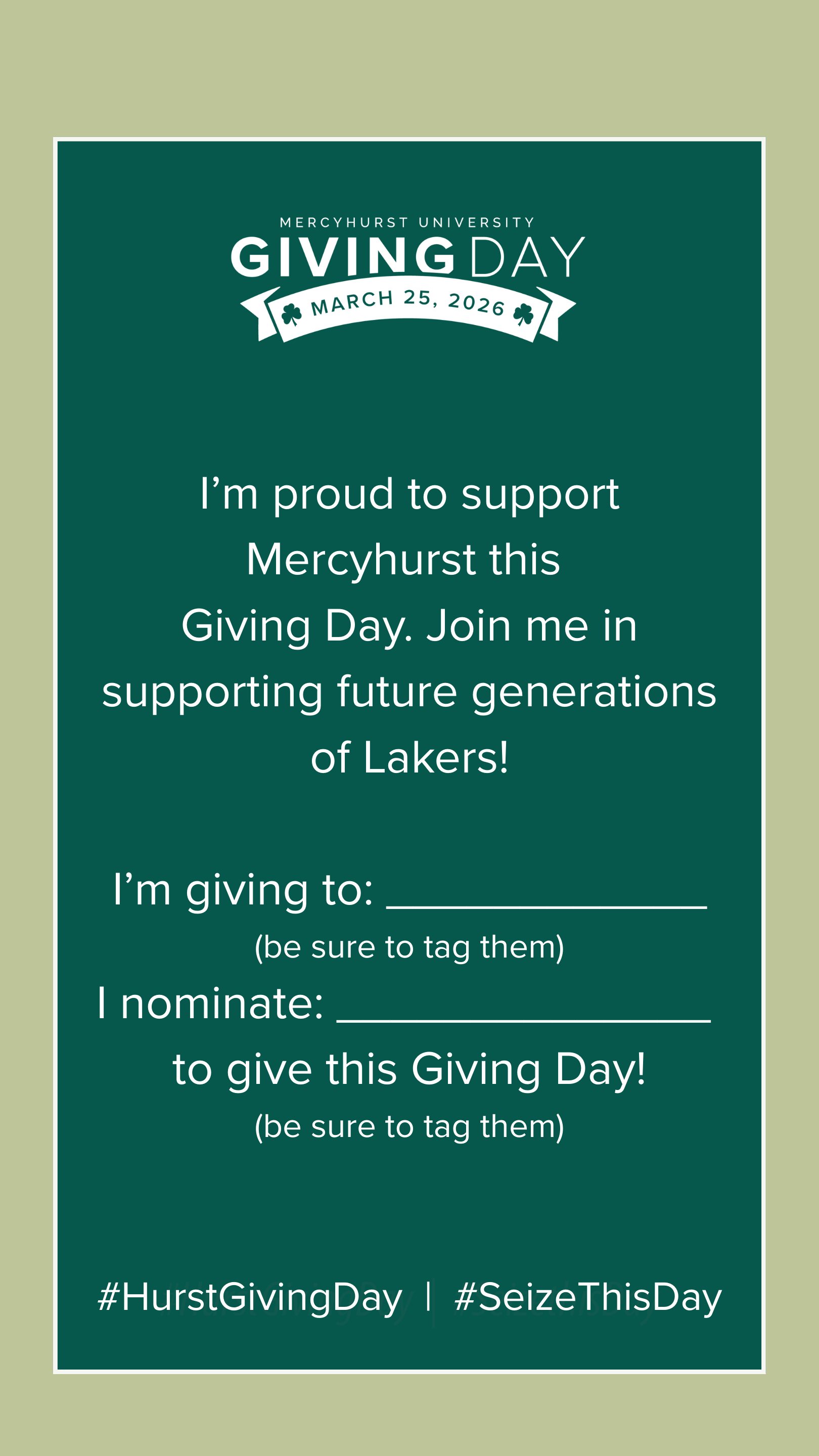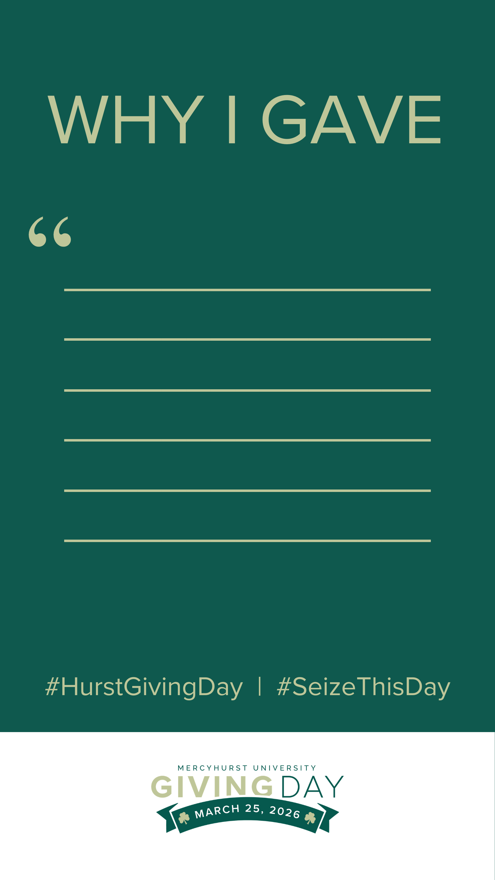 Follow along with us and be sure to tag @Mercyhurstu, @HurstAlumni, @HurstAthletics, and @HurstTheatre and use the hashtags #HurstGivingDay and #SeizeThisDay for a chance to be highlighted. We want to see how you #SeizeThisDay on March 25!